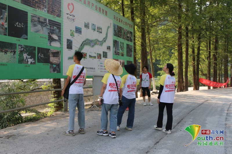 图为志愿者在用脚步丈量马头溪村的过程中,通过村里的宣传栏,进一步了解马头溪村的产业布局、特色农产品等信息。中国青年网通讯员 李景芬 摄
