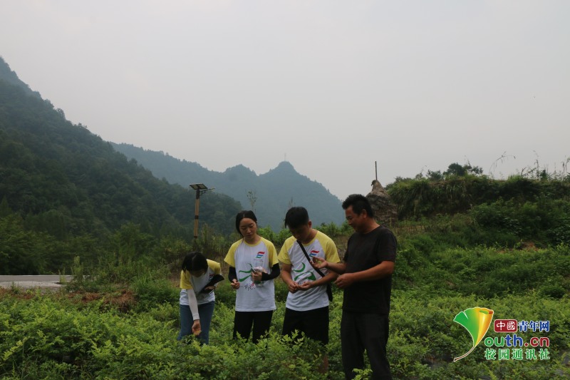 图为志愿者在村主任的带领下来到莓茶茶园,了解莓茶生产情况,为莓茶包装设计提供思路。中国青年网通讯员 李景芬 摄