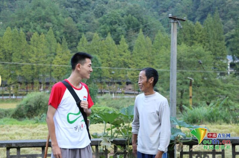 图为志愿者与村民交流吊脚楼的建筑造型和风格。马头溪村的吊脚楼风格以两进两重堂、双手推车吊脚、钥匙头、一字长龙、转阁楼等为主。中国青年网通讯员 李景芬 摄