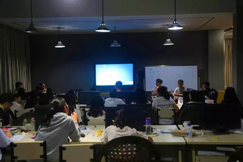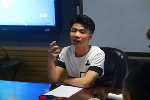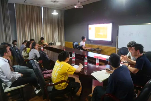 交流会伊始,由主持人介绍会议嘉宾。随后,由学生团队:言越美术文化设计工作室(丁允辉)、美家装饰工程公司(彭瑜)、泛众影视(樊玉麒)、泛众艺术品交易平台(陈述)、吉承视觉设计工作室(曾陈福)依次进行发言,与学生及嘉宾进行互动。
