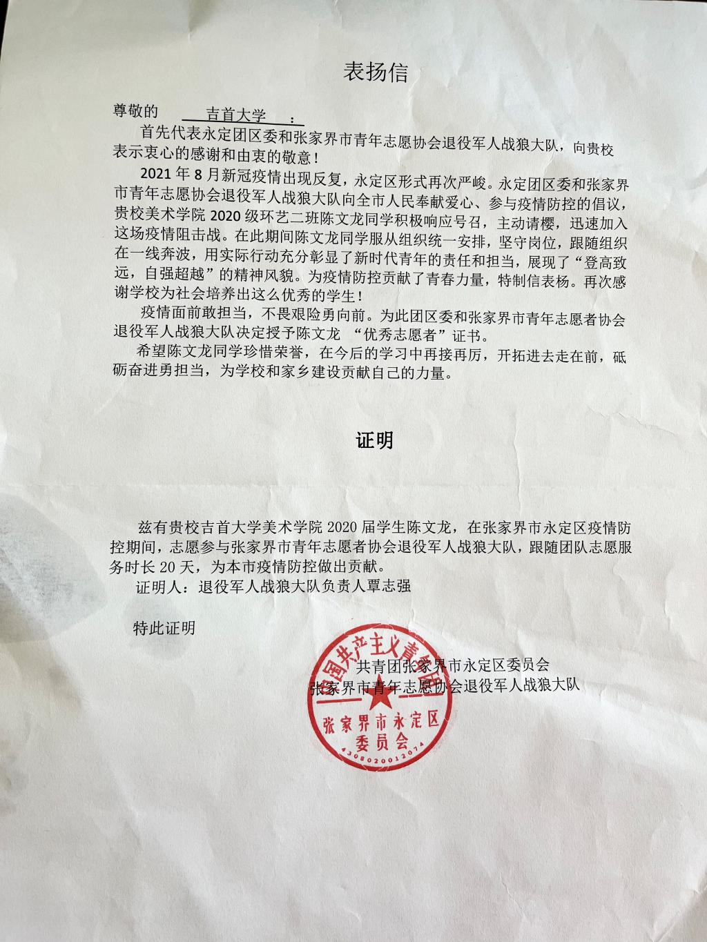 2021年11月19日,我院收到两封来自永定团区委和张家界市青年志愿协会退役军人战狼大队的表扬信,信中对我院2019级学生李桐桐、2020级学生陈文龙在2021年张家界疫情防控中的突出表现表示肯定并提出了表扬。