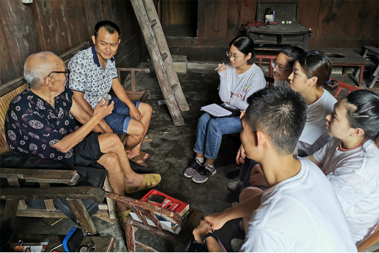从老前辈彭心宽家中离开后,小分队一行前往土家织锦国家级传承人刘代娥老师家中拜访学习,深入了解了土家织锦的传统图案及其所蕴含的丰富文化内涵。小分队成员积极地参与到织锦的生产中,在刘代娥老师的耐心讲解与悉心指导下,通过切身实践对土家织锦的制作过程有了进一步的熟悉。小分队成员与刘代娥老师一同探讨了土家织锦的传承与发展的有关问题。小分队队员赵二保表示,未来将利用自身在环境设计方面的专业优势,通过对土家织锦在村落环境建设中的应用研究来传承与发展土家非遗文化。