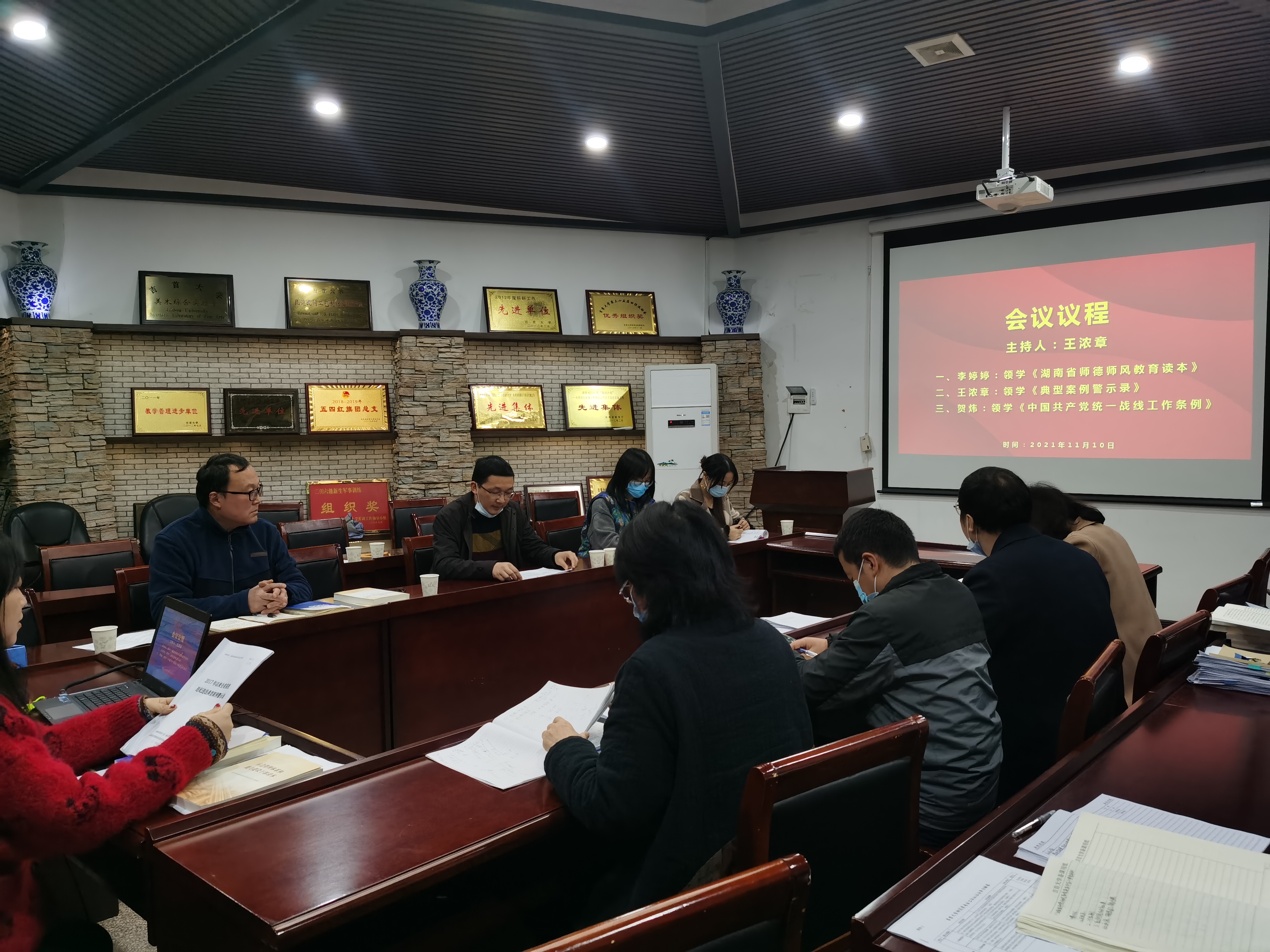 会议伊始,王浓章书记传达了学校吉大人通〔2021〕 2号关于组织学习《湖南省师德师风教育读本》和《典型案例警示录》(以下简称《读本》和《警示录》)的通知的要求,并强调2021年是湖南省师德师风建设年,请大家务必提高认识,认真学习贯彻文件要求,严肃政治纪律和政治规矩,严守师德师风底线和红线,努力营造风清气正的政治生态和育人环境。