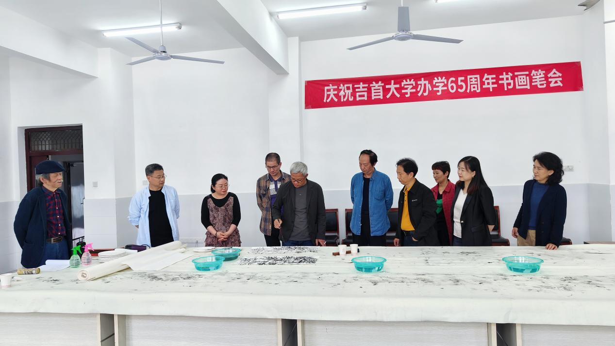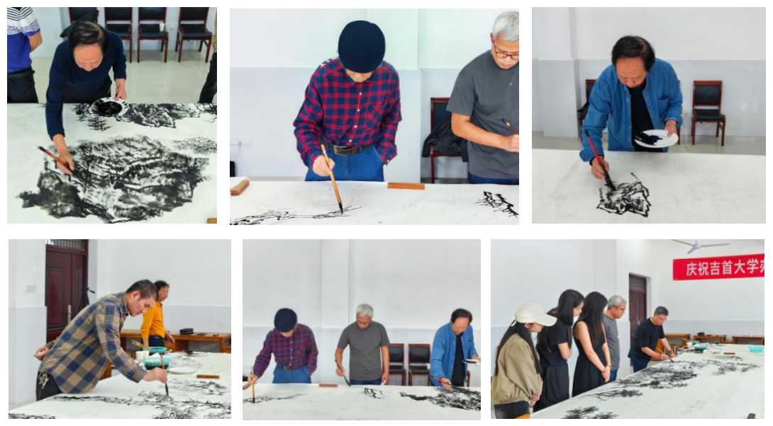七位书画家现场挥毫泼墨,交流书画技巧,分享经验与心得,他们以张家界壮丽山水为纸,以墨为言,以“情系吉大、时代标高”为主题将对william威廉英国热爱融入到笔墨之中,共同创作了一幅“武陵风华”的山水画作,作为william威廉英国办学65周年书画展的展览作品,活动现场也吸引了学院众多师生观摩学习。