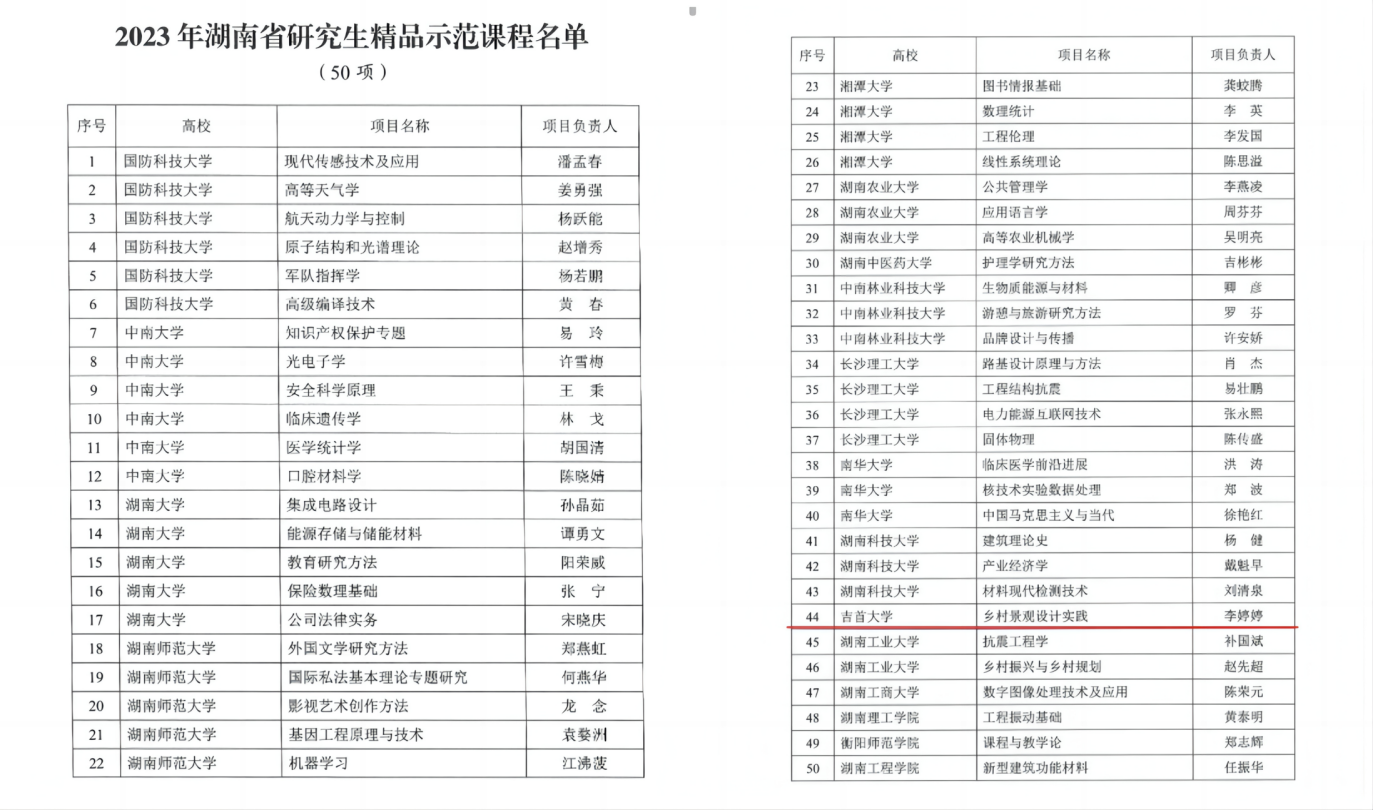 近日,湖南省教育厅公布了2023年湖南省研究生精品示范课程,省教育厅组织专家会议评审,认定湖南省研究生精品课程50门。我院硕士研究生导师李婷婷的“乡村景观设计实践”立项2023年湖南省研究生精品示范课程。