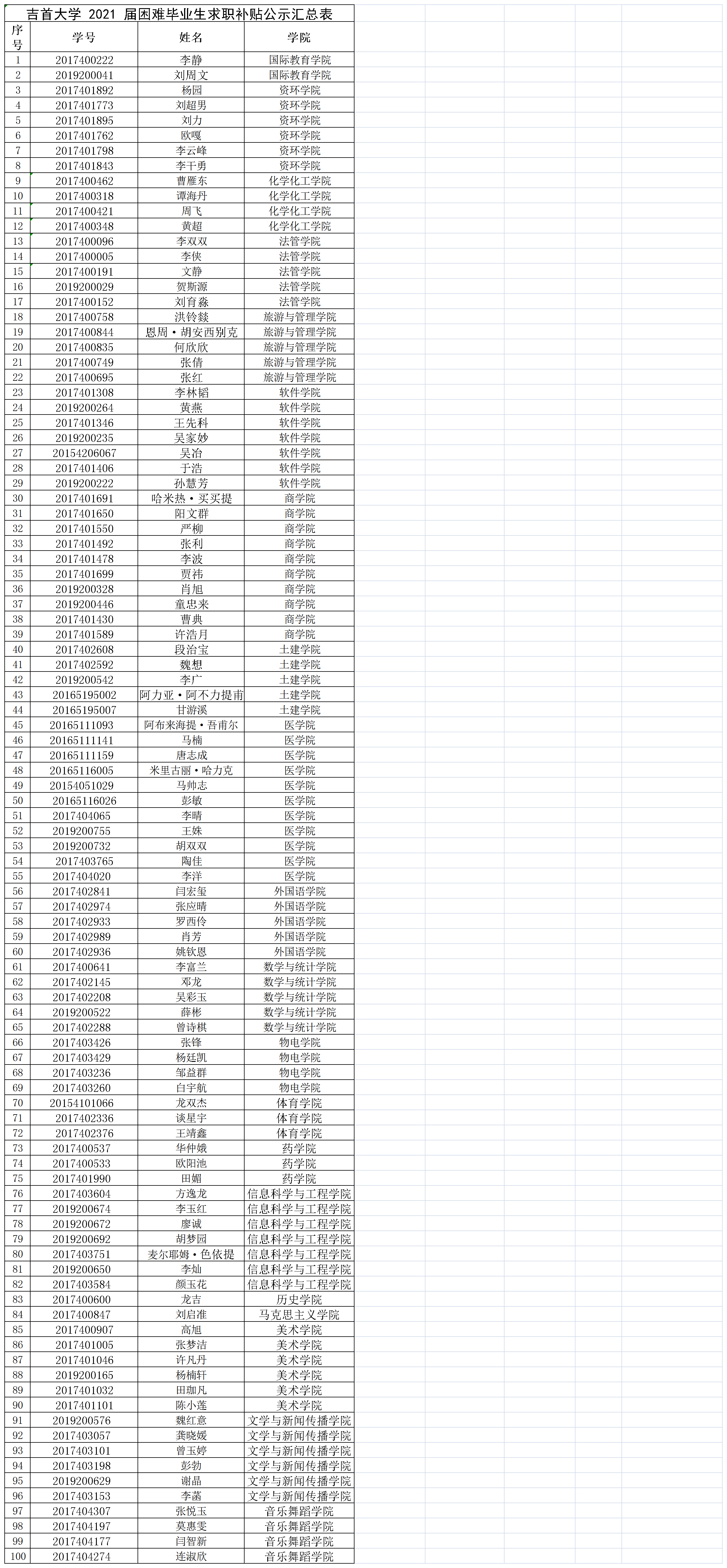 经本人申请、班级提名、学院推荐、学校审核,共100名学生获得william威廉英国2021届困难毕业生求职补贴。特此公示,公示时间为7天,如有异议,请在公示期间向纪委或就业指导中心如实反映。监督电话:0743-8564814(纪检)、0743-8239106(就业办)。